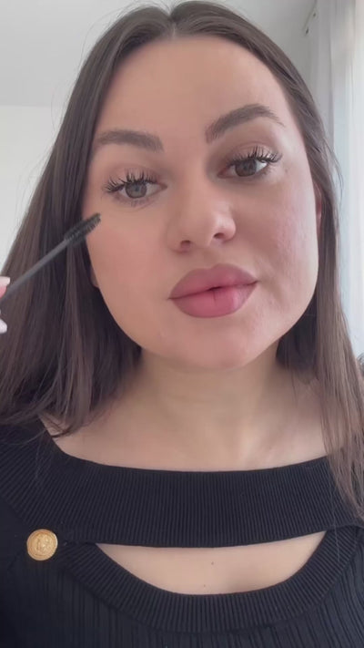Une fois les yeux maquillés et les cils bien secs, tu sprayes, tu brosses, et c’est terminé.